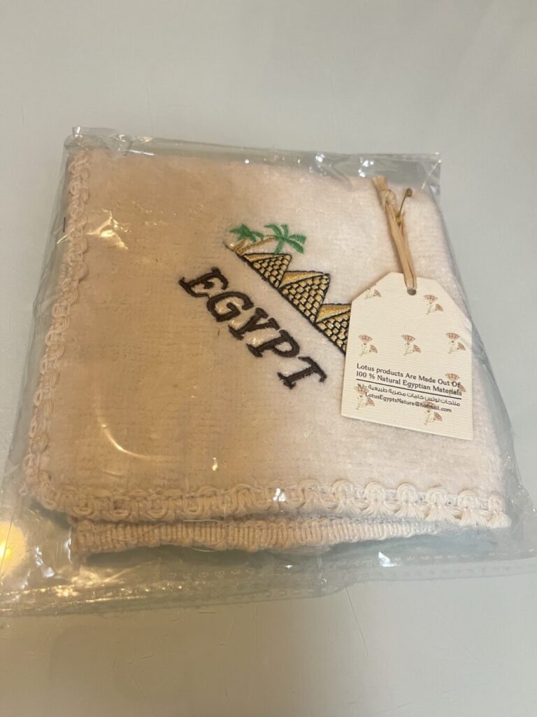 添乗員の方に連れて行ってもらったお店は日本人も気に入るようなアイテムが数多くありました。エジプトの生地や繊維がとても優れているのは有名ですが、エジプトならではのデザインのハンドタオルやシルクのストールやスカーフなどを買っている方が多かったように思います。私もハンドタオルを2つほど買いました。「ピラミッド」と「メジェド」のデザイン。メジェド、可愛すぎる!